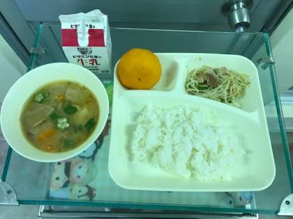 7月10日(水)ピリ辛野菜いため、オクラとん汁、ごはん、牛乳、冷凍みかん