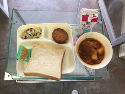 7月17日(水)チキンレバーカツ、ケチャップ煮、たことキャベツのソテー、りんごジャム、パン、牛乳