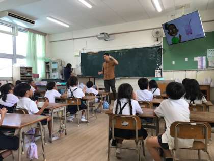 7月17日(水)今日のイングリッシュタイムはラファエル先生のアナウンスで始まりました。その後、1年1組にラファエル先生が来られ、子どもたちは大喜びでした。