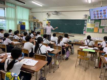 8月28日(水)1時間目、5年1組はラファエル先生と英語の学習をしていました。○月という言い方と国の名前と国旗、行事等を関連づけて学んでいました。