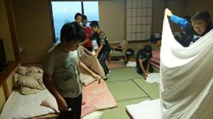 6時に起床しました。朝起きてまず、布団たたみからスタートです。まだ眠いまなこをこすりながら、それぞれ布団やシーツなどをたたんでいます。