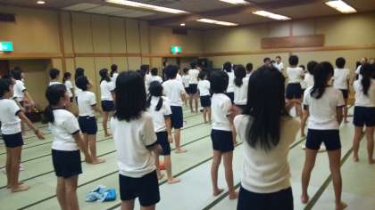 そして、朝の集いは、外があいにくの雨のため、大広間に集まっての朝の集いになりました。
