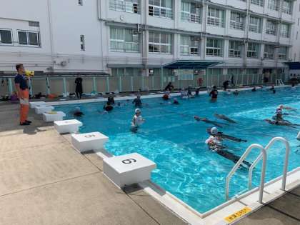 9月2日(月)5時間目、6年生はプールで着衣泳を体験しました。大正消防署の方から、ペットボトルやビニル袋を使ってどのように水に浮かび、命を守ったらよいかを教えていただきました。服を着たままプールに入った瞬間に子ども達からは、「重い。」という声が聞こえてきました。