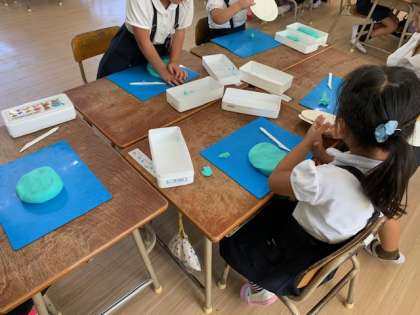 9月3日(火)5時間目、1年2組は図工でピザを作っていました。おいしそうなピザができたでしょうか?