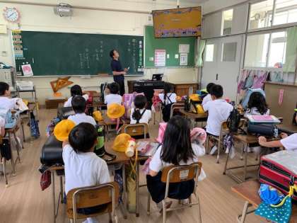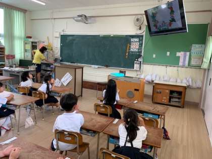 9月4日(水)昼のイングリッシュ・タイム。2年1組では、「さんぽ」の歌うぃ英語で歌っていました。