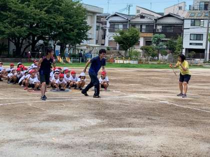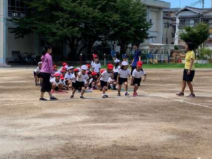 9月6日(金)3時間目、1年生は運動場でかけっこの練習をしていました。最初は、「よーい、ドン」の仕方を先生の見本を見ました。その後、実際に運動場を半周走りました。