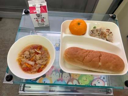 9月10日(火)豆乳マカロニグラタン、トマトスープ、パン、牛乳、冷凍みかん