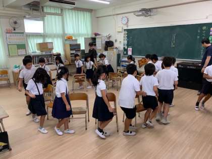 9月18日(水)5時間目、2年1組は学級活動で話し合いをした後、みんなでいすとりゲームをしていました。