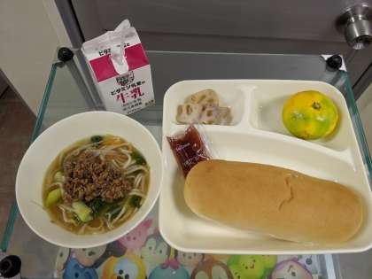 10月8日(火)タンタンめん、れんこんのオイスターソース焼き、パン、牛乳、みかん、いちごジャム