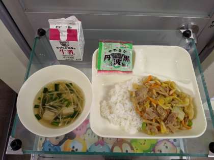 10月17日(木)ピリ辛丼(ごはん)、中華スープ、牛乳、ソフト黒豆