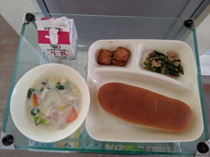10月18日(金)はくさいのクリーム煮、あつあげのごまじょうゆかけ、豚肉とさんどまめのオイスターソースいため、パン、牛乳