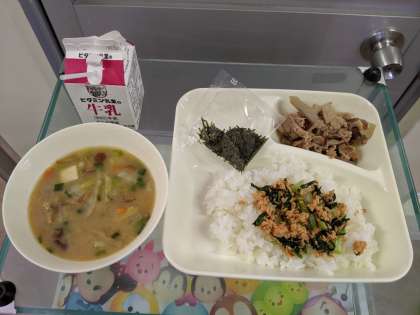 11月6日(水)さけとこまつなのご飯、豚肉とれんこんの甘辛焼き、冬野菜のみそ汁、牛乳