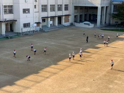 11月8日(金)1時間目、2年1組は運動場で体育をしていました。体をあたためた後、ドッジビーをしていました。ドッジビーとはフリスビーでドッジボールをするゲームです。