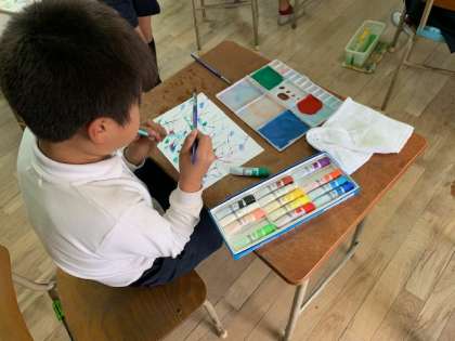 11月18日(月)5時間目、4年1組は図工をしていました。画用紙に置いた絵具をストローで吹いて模様を作ったり、ビー玉に色をつけて転がして模様にしたりしていました。