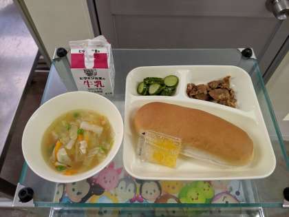 11月19日(火)豚肉のデミグラスソース、スープ、きゅうりのサラダ、パン、牛乳、マーマレード