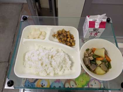 12月2日(月)鶏肉と野菜の煮もの、じゃこ豆、かぶのゆず風味、ごはん、牛乳