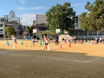 12月13日(金)4時間目、5年1組が体育をしていました。ジグザグドリブルをしていたので、先生に聞きますとバスケットボールの練習だそうです。