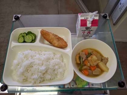 12月23日(月)豚肉とあつあげの煮もの、あっさりきゅうり、たらのフライ、ごはん、牛乳