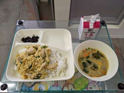 1月14日(火)親子丼、みそ汁、黒豆の煮もの、牛乳