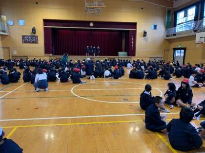 1月15日(水)今日の児童集会は、集会委員の人が歌詞の一部を棒読みして、曲名をあてるクイズでした。ほんの少しの歌詞で曲がわかる人が多く、びっくりしました。