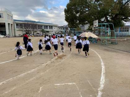 1月15日(水)昨日から業間持久走が始まりました。今日は3年生と4年生が千島グランドへ試走に行きましたので、この時間は、1年と5年が運動場を走りました。