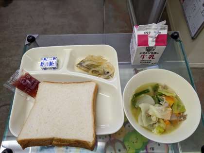 1月15日(水)あじのレモンマリネ、てぼ豆のスープ煮、パン、牛乳、固形チーズ、いちごジャム