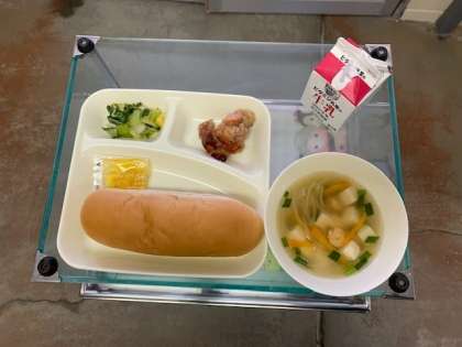 1月22日(水)鶏肉のオイスターソース焼き、えびととうふのスープ、チンゲンサイのピリ辛あえ、パン、牛乳、マーマレード