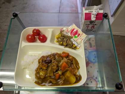 1月24日(金)豚肉と金時豆のカレーライス、ごぼうサラダ、プチトマト、牛乳