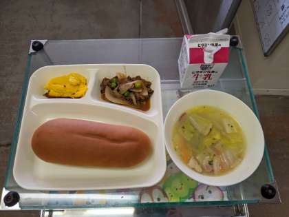 2月3日(月)牛肉のデミグラスソース煮、コーンスープ、かぼちゃのプリン、パン、牛乳