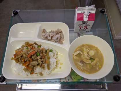 2月25日(火〉鶏ごぼうご飯、みそ汁、焼きれんこん、牛乳