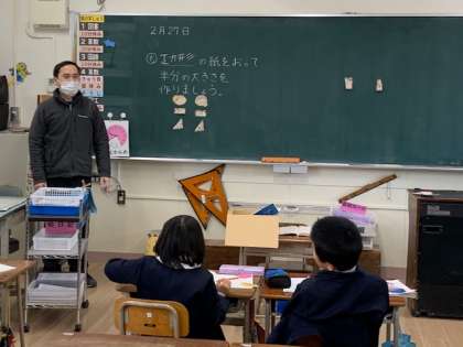 2月27日(木)2時間目、2年1組は算数でした。2分の1の学習でした。清水先生のポケットの中のビスケットから授業が始まりました。