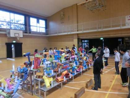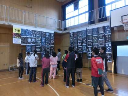 作品展の開催を明日の夕方に控え、教員が講堂に集合し、研修会を開きました。各学年の子どもたちの作品を目の前に、それぞれの指導について交流しました。