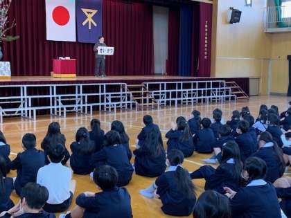 3月24日(火)午前の部の修了式が行われました。写真は生活指導のお話をする清水 幸広先生です。修了式に先立って、漢字検定等の表彰も行いました。