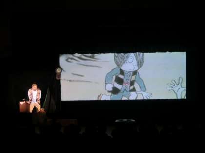 上演された作品は、劇団影法師による「ゲゲゲの鬼太郎」でした。カラーの影絵劇で、子どもたちは不思議そうにスクリーンに見入りながら、楽しく鑑賞していました。