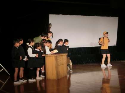 1・2時間目に低学年、3・4時間目に高学年と、2回にわたって本校講堂にて影絵劇を上演してもらいました。