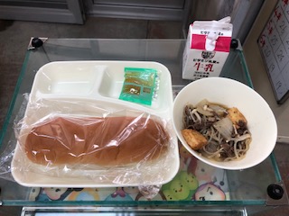 本日より学校給食再開されました。 献立はすき焼き煮、パン、りんごジャムでした。