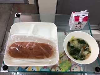 今日の献立は、中華スープ、こくとうパン、牛乳です。