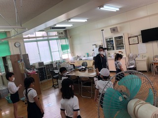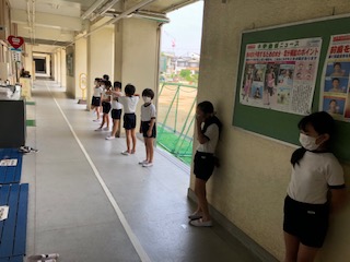 3年生になってはじめての発育測定です。今年は密にならないよう、廊下で間を空けて並びます。保健室の床にも足形がつけられていて、それを目印に間を空けて並び、測定を受けていました。