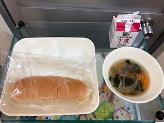 今日の献立は、ハムと野菜の中華スープ、おさつパン、牛乳です。