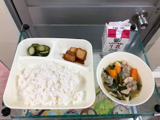今日の献立は、中華煮、あつあげのピリ辛じょうゆかけ、きゅうりの中華あえ、ごはん、牛乳です。