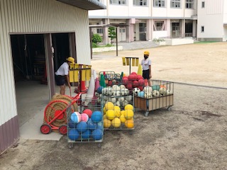 運動委員会は、体育倉庫のボールやコーンなどを出し、倉庫の中をきれいに掃除していました。