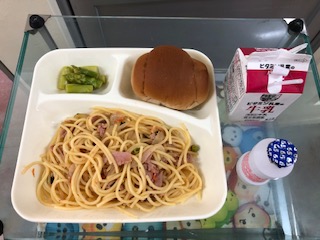 今日の献立は、ポークトマトスパゲッティ、グリーンアスパラガスのサラダ、発酵乳、1/2こくとうパン、牛乳です。