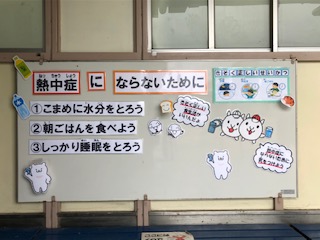 保健室の掲示板も、そんな季節に合うよう内容にリニューアルされました。熱中症にならないように、「水分をこまめに」「朝ごはんを食べる」「しっかり睡眠」の3つのことに注意して、暑い季節も健康に過ごしたいものですね。