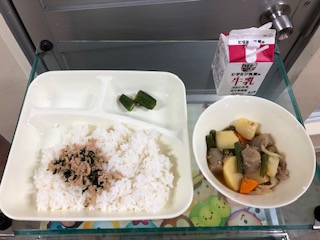 今日の献立は、豚肉とじゃがいもの煮もの、オクラの梅風味、ツナっ葉いため、ごはん、牛乳です。