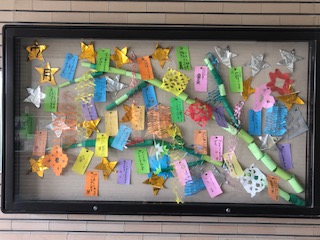 玄関の掲示板には2年生の七夕の短冊が飾られています。どんな願い事が飾られているのでしょうか?