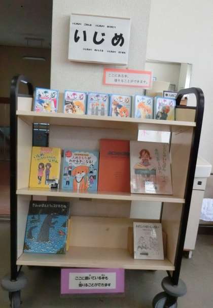 「いじめについて考える日」に合わせて、図書館にはいじめに関する本のコーナーをつくっています。雨で運動場で遊ぶことができない日が続いているので、ぜひ本を読みに来てほしいです。