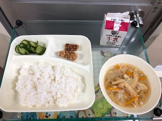 今日の献立は、豚肉の香味あげ、すまし汁、あっさりきゅうり、ごはん、牛乳です。