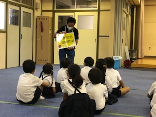 大正区役所から、ツージイ隊の皆さんが来て、1年生に「防犯」のお話をしてくださいました。