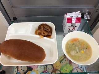 今日の献立は、煮こみハンバーグ、コーンスープ、こくとうパン、牛乳です。