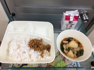 今日の献立は、鶏肉とじゃがいもの煮もの、紅ざけそぼろ、ごはん、牛乳です。